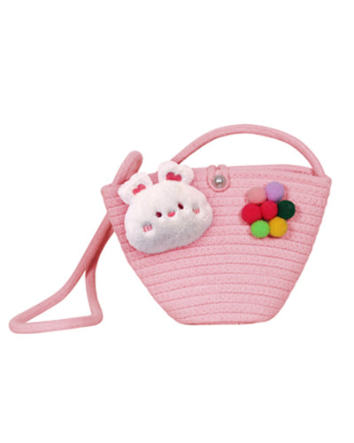 - Peluches applicati e patch decorativi. Borsina in corda, chiusura con bottone perlato.