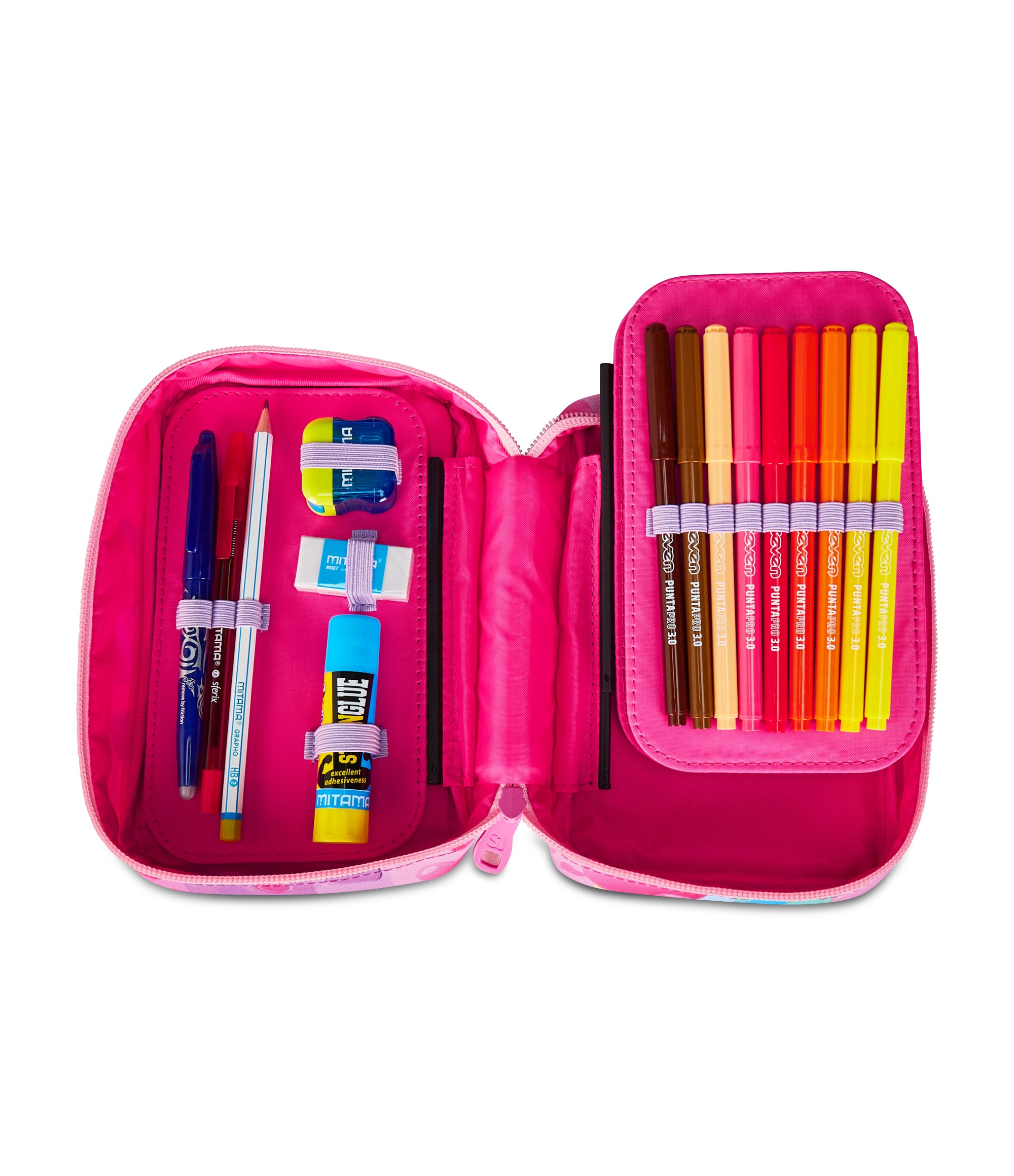 - Apertura singola tramite zip, plance amovibili, elastici interni per cancelleria. CONTENUTO 44 PEZZI: 1 penna cancellabile BLU, 1 penna sfera rossa, 18 pastelli a colori 4.0 esagonali, 18 pennarelli superlavabili punta 3.0, 1 matita grafite esagonale HB, 1 colla gialla azzurra, 1 gomma bianca con cartoncino stampato, 1 temperino barilotto 2 fori, 1 righello trasparente azzurro, 1 paio di forbici in metallo con maniglia in plastica