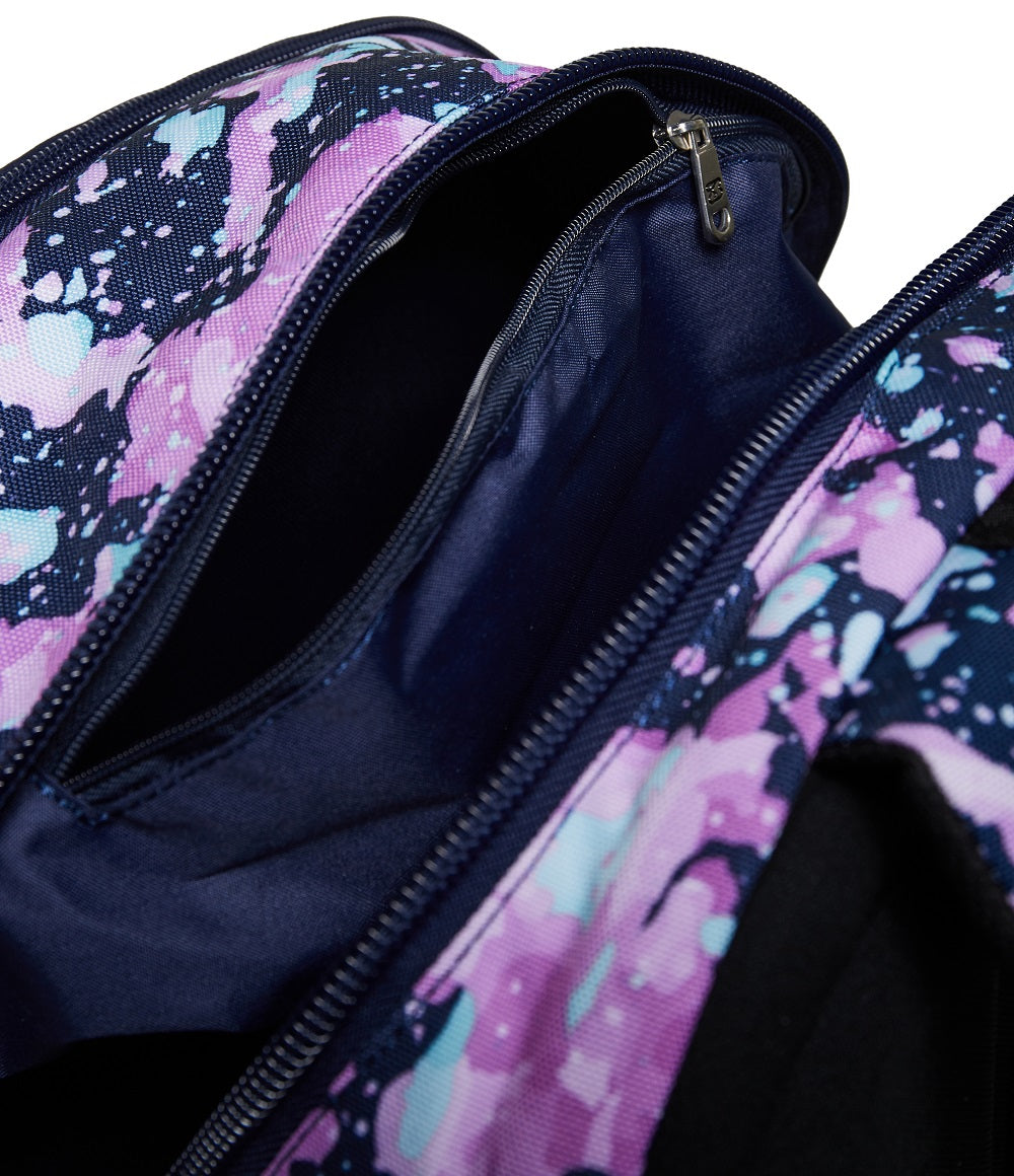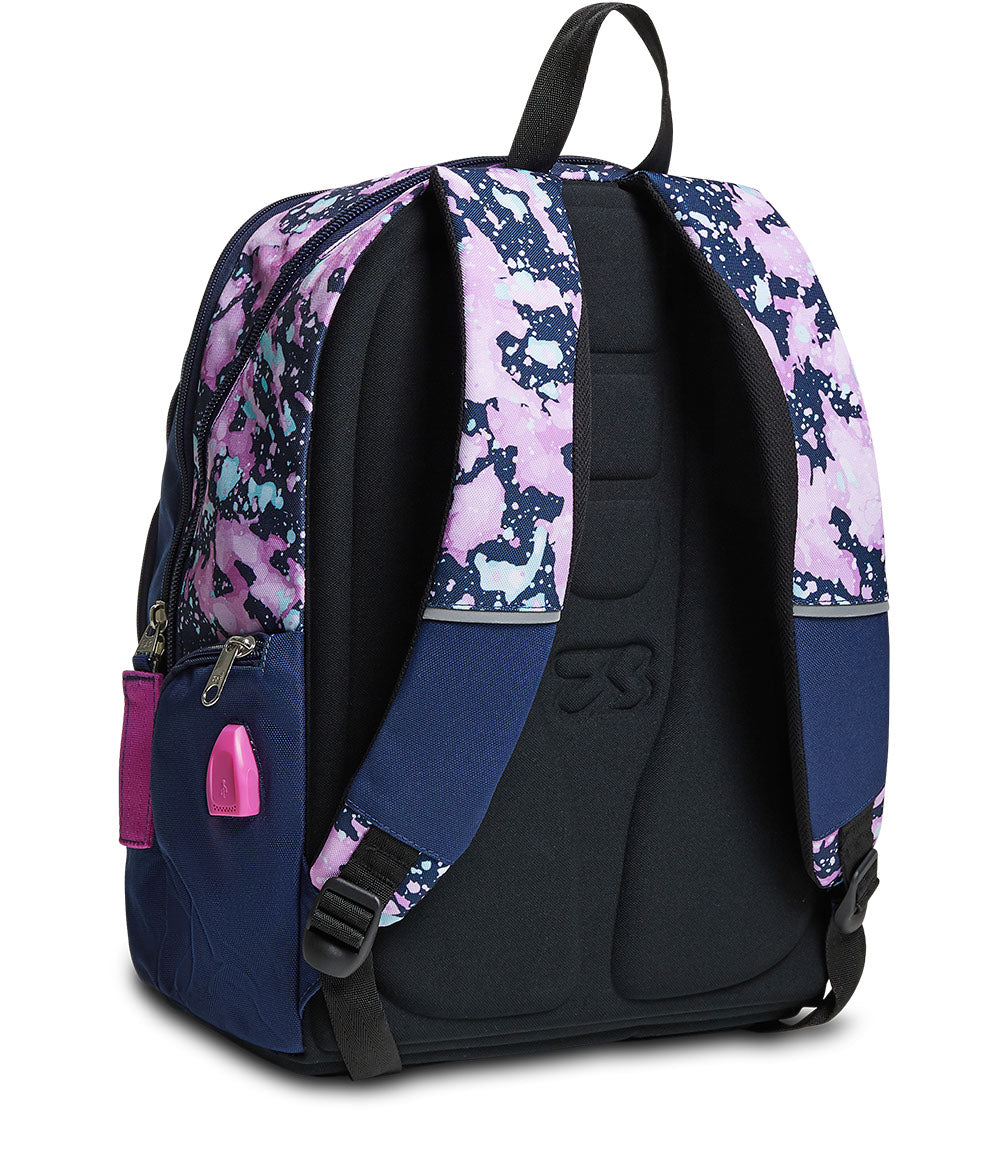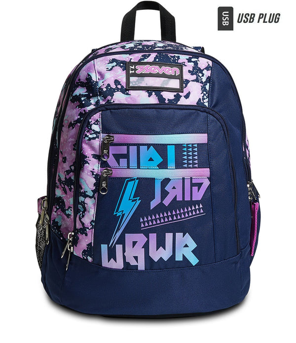 - Zaino doppio scomparto con USB PLUG laterale, apertura dello scomparto principale facilitata, zip resinata ed a rovescio su tasca frontale, stampa sfumata su tasca frontale