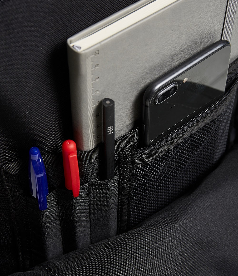 - Secret pocket interna, tasca interna porta tablet/PC, tasche laterali: una chiusa con zip ed una in rete portaborraccia