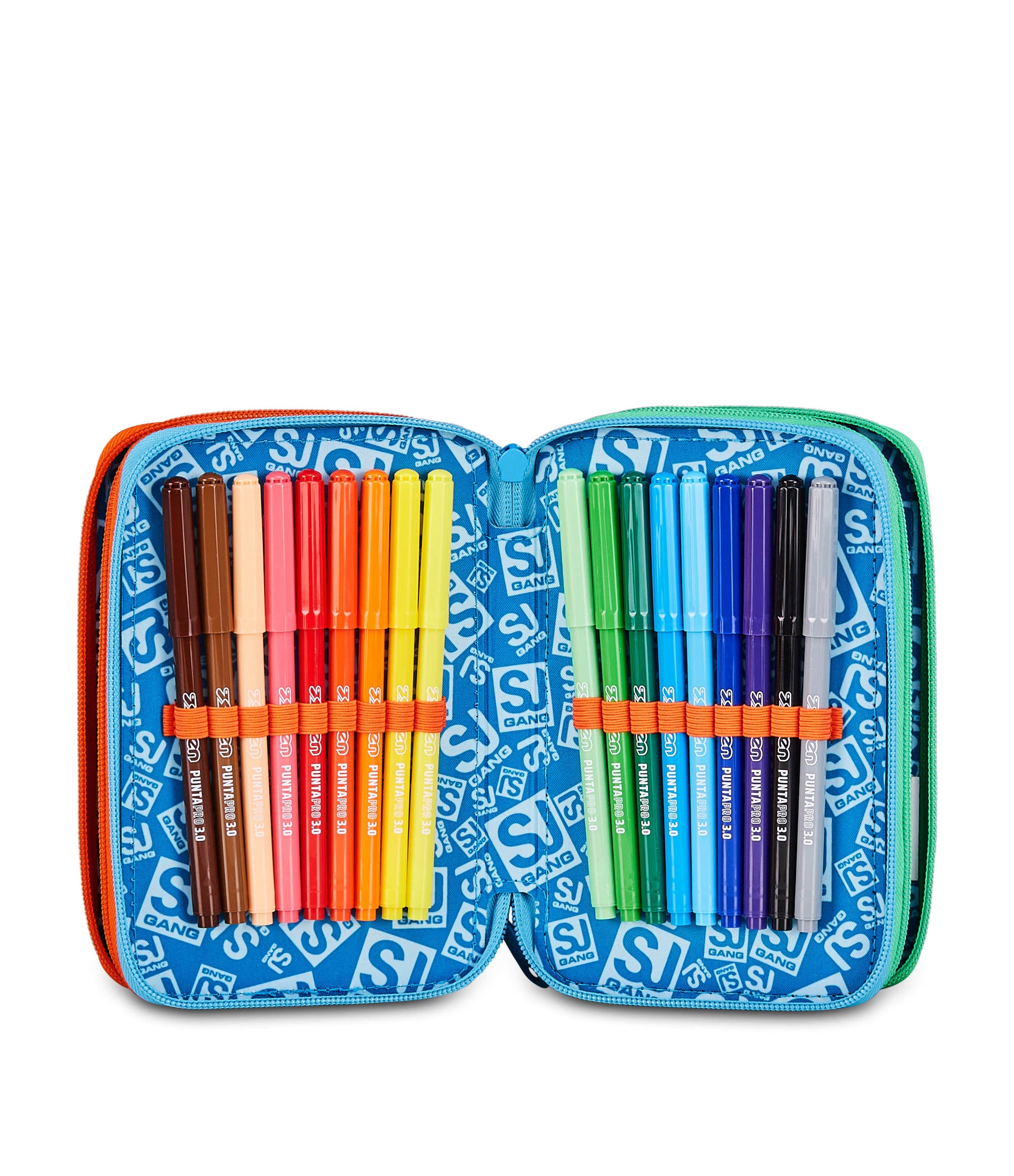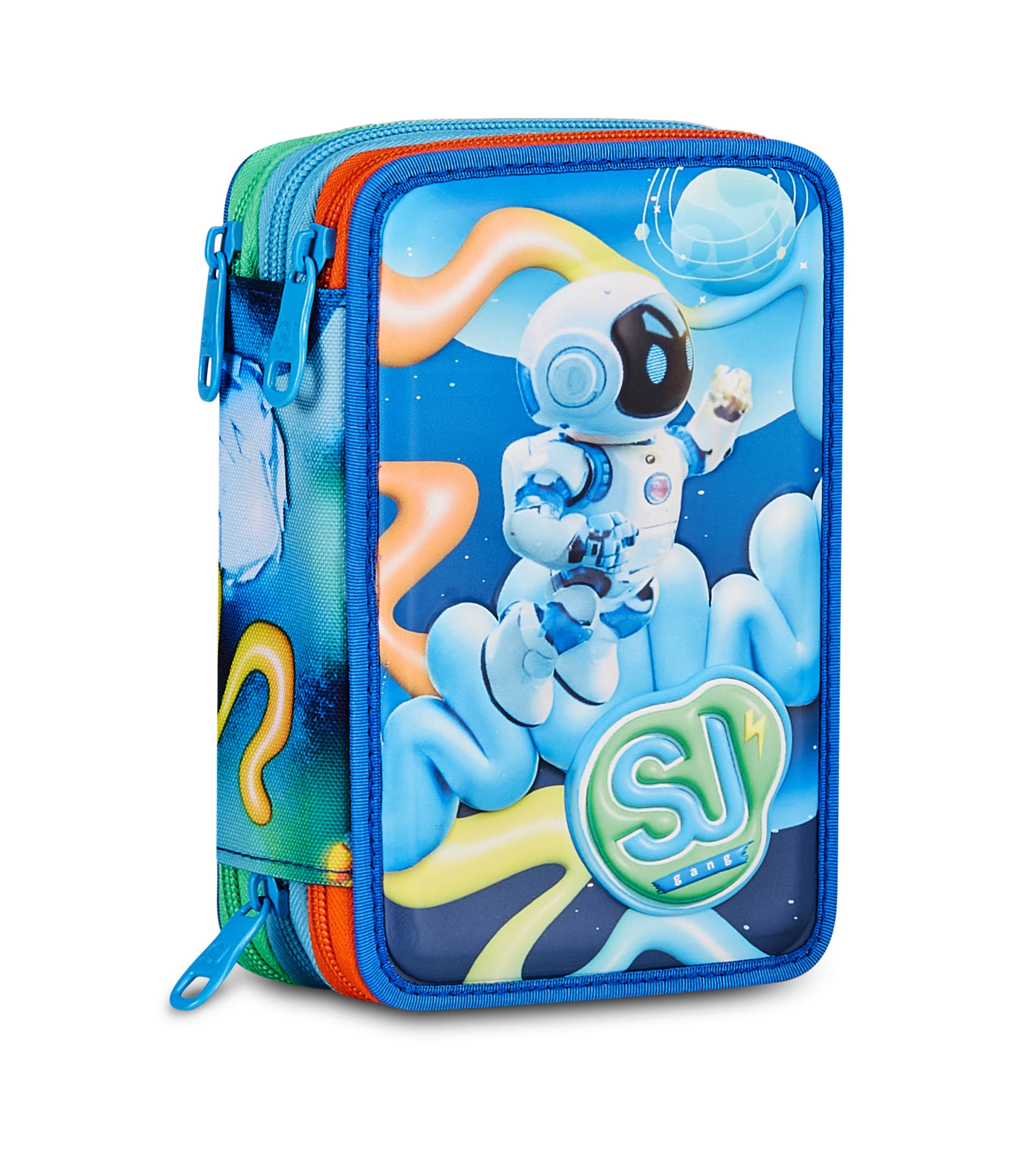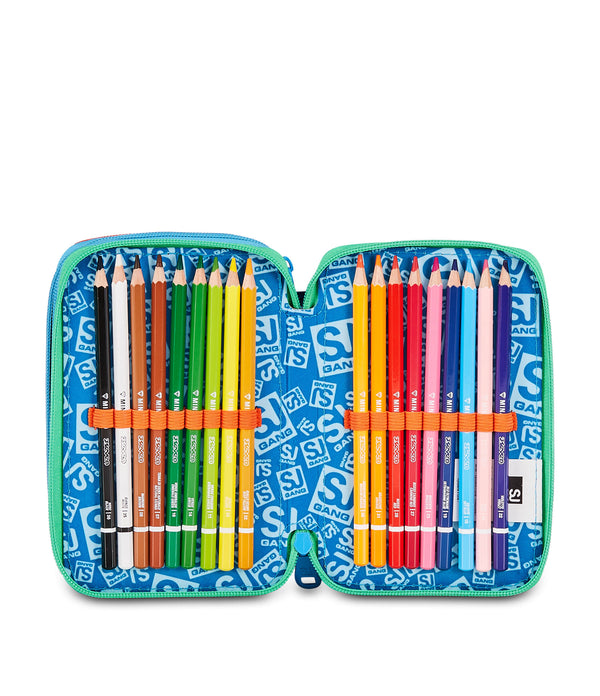 Hi! I’m the super colourful SJ Gang 3D 3-Zip pencil case, featuring semi-rigid shells and a raised 3D design. With three fully equipped compartments, I include everything you need to tackle your schoolwork at your best. Pair me with an SJ Gang backpack or trolley for a perfectly coordinated look!