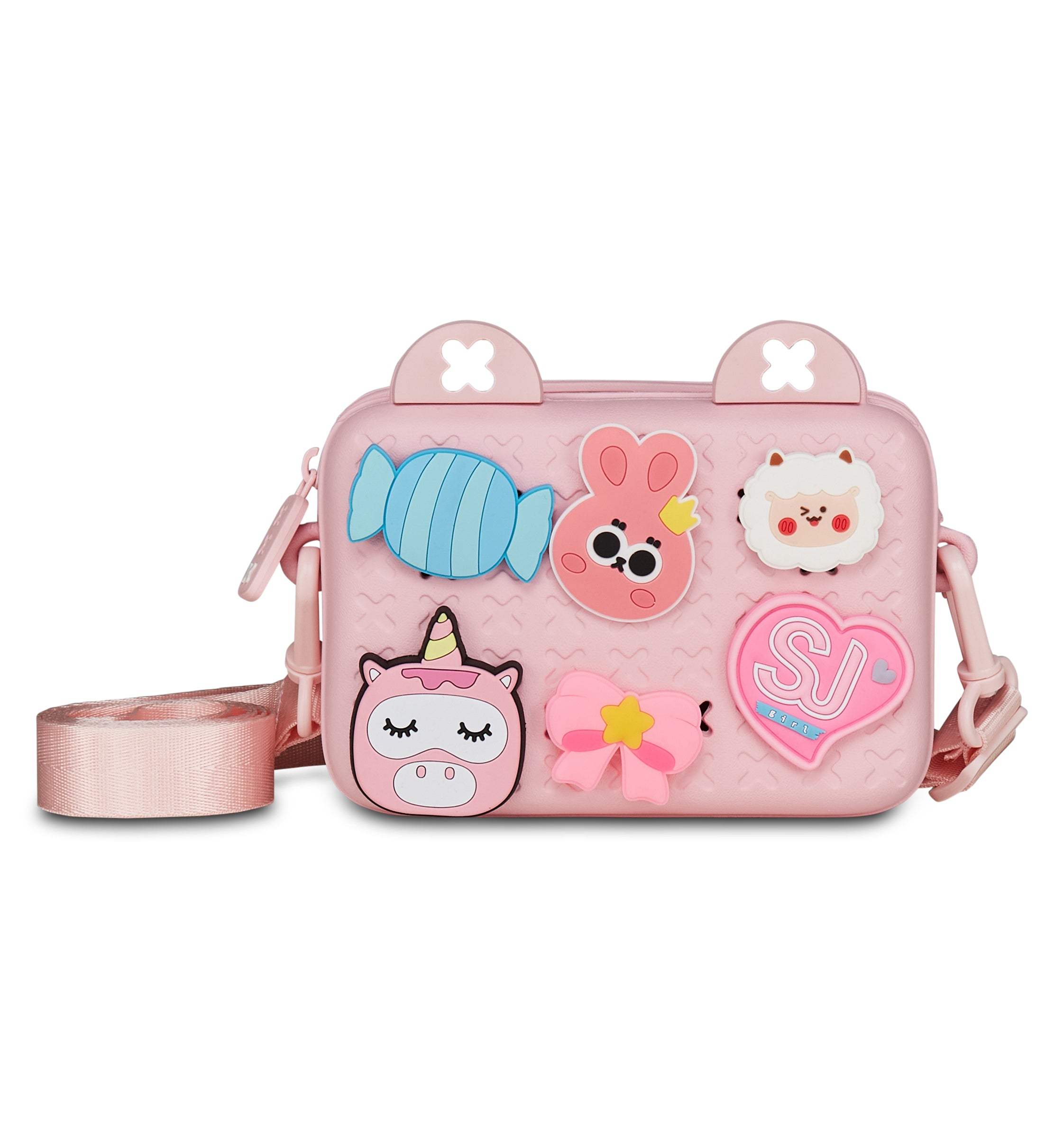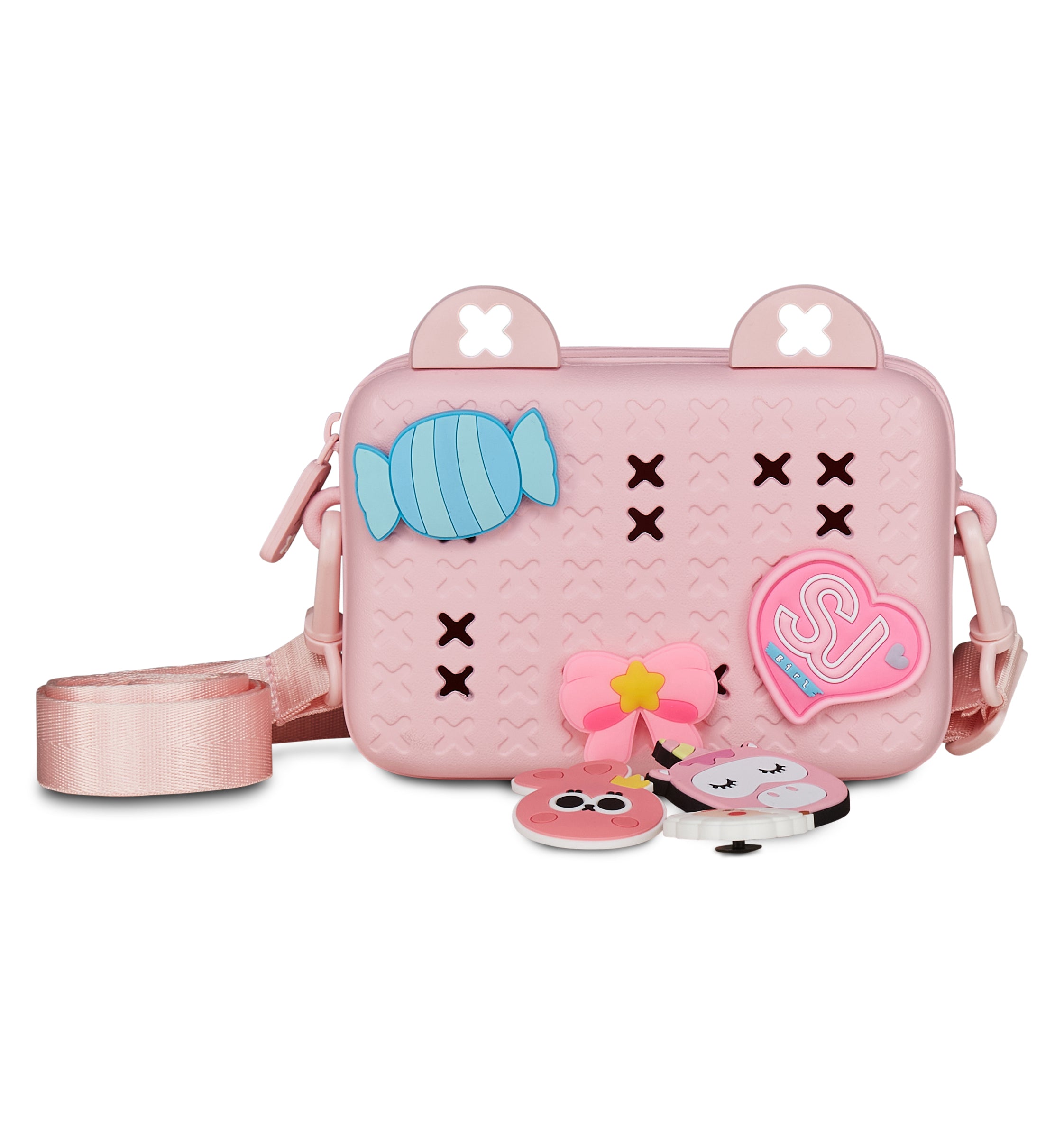 Customizable Crossbody Bag with Removable Pins. Features an adjustable shoulder strap.