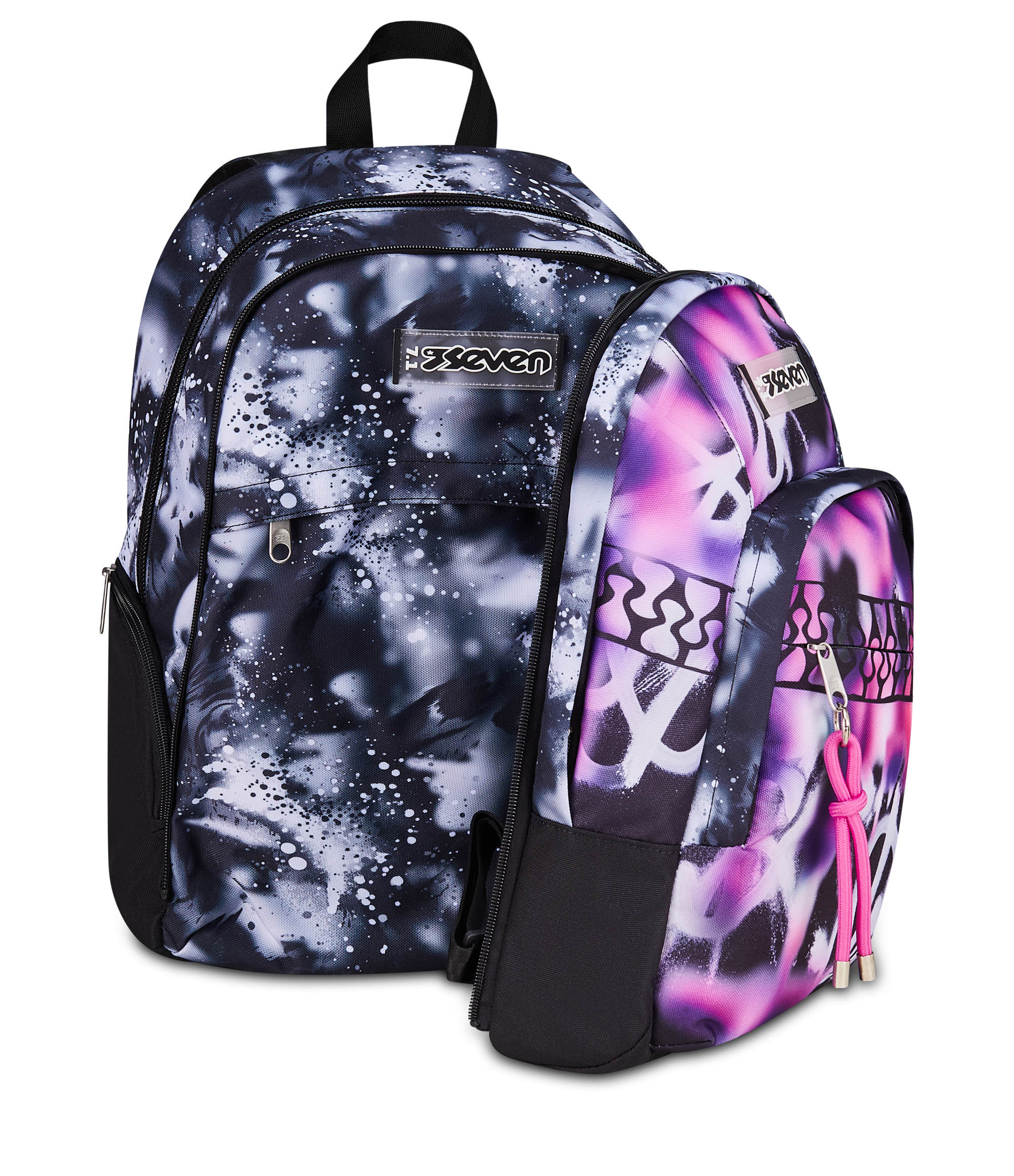 Seven Dual Detach is a versatile backpack with a spacious double compartment that converts into a smaller daypack by detaching the front compartment with a zip. It features dedicated space for books, a laptop or tablet, a water bottle, and clothes, plus a front organizer pocket for small essentials. Padded shoulder straps, a padded back panel, and an integrated base ensure comfort and balanced carrying throughout the day.