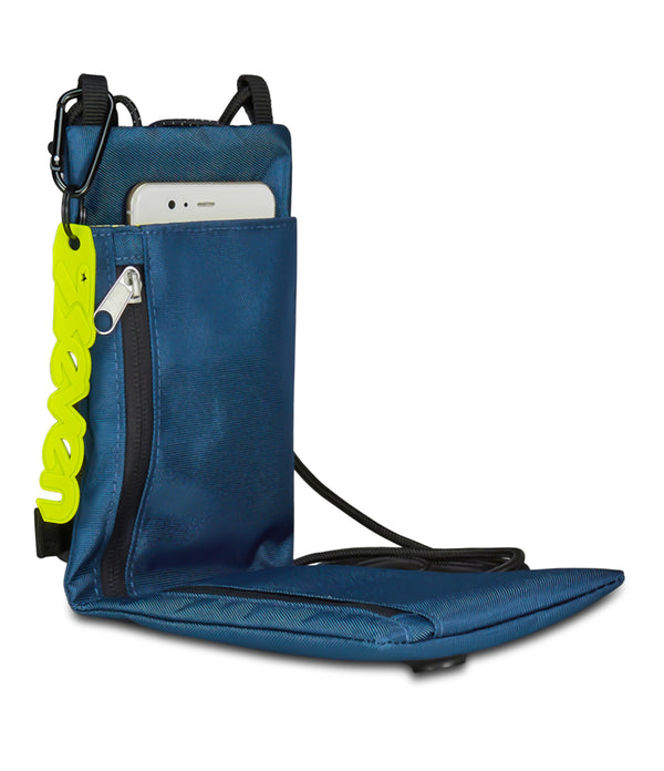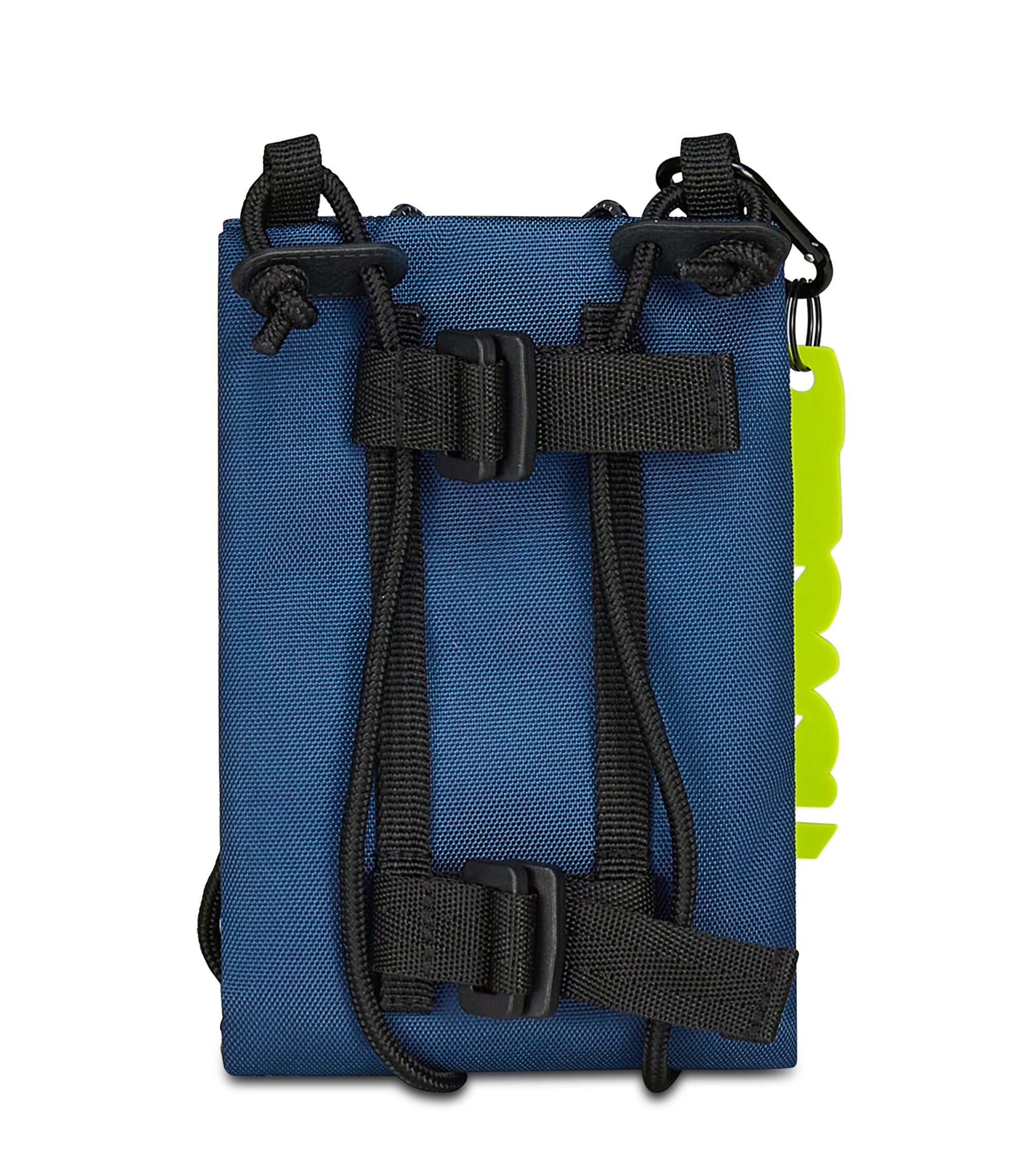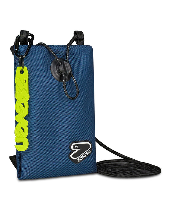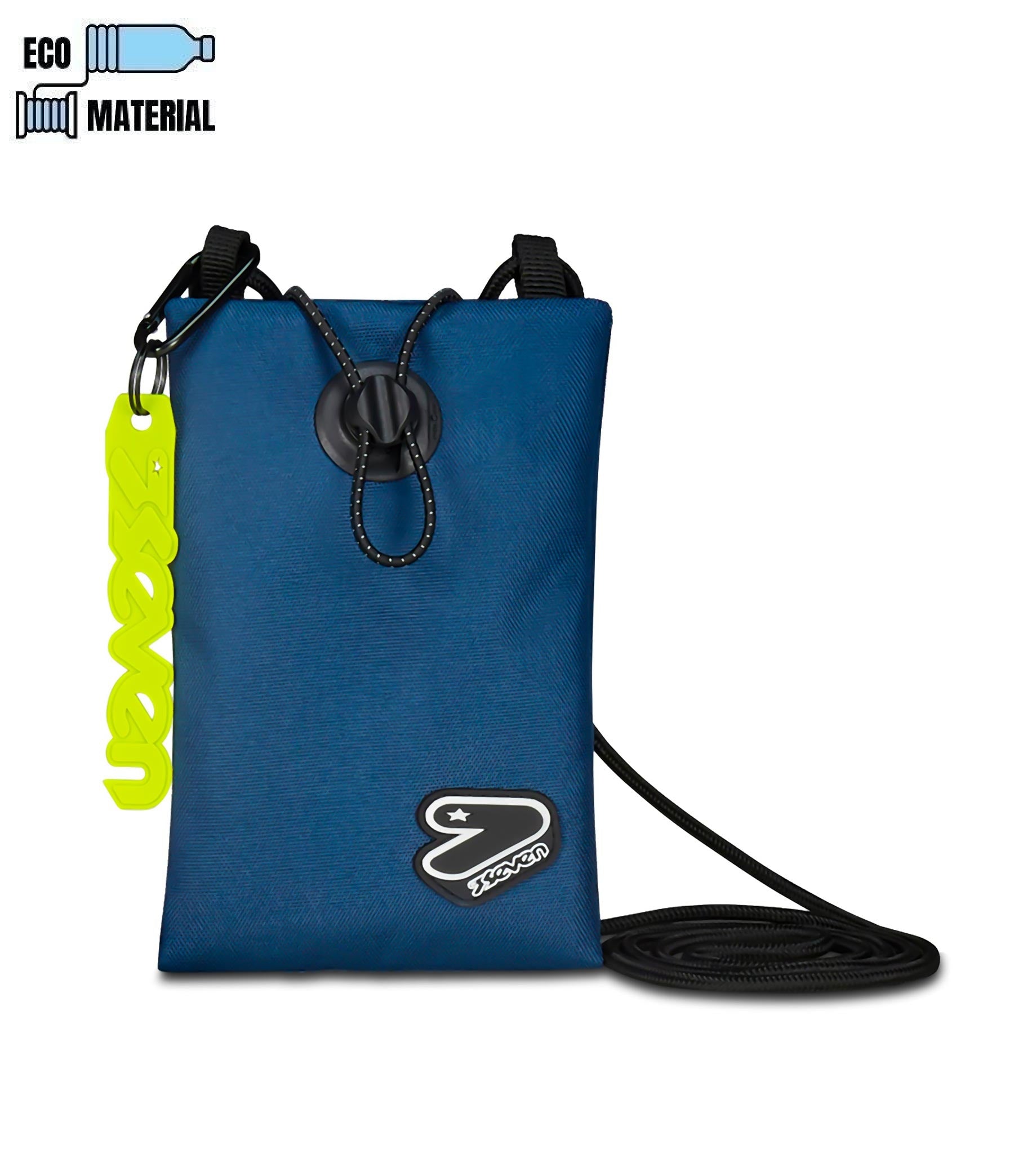 Wallet closure system with magnetic drawstring holder. Adjustable shoulder strap. Rubber logo label.