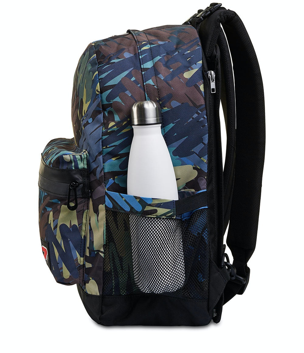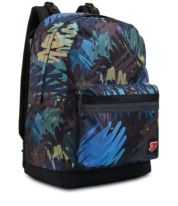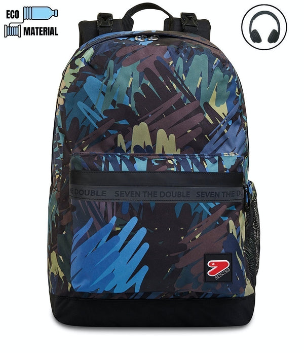 With the reversible backpack Seven The Double you have 2 backpacks in 1: one in fantasy, the other in solid color. To turn it over as many times as you want, detaching the backrest, you just need 3 simple moves. In combination you also have WIRELESS HEADPHONES to always listen to your playlist. The reversible backpack is made of eco-friendly recycled polyester made from 29.5 500 ml PET bottles, ensuring all the quality standards of our materials. Both sides, in fantasy and solid color, have a comfortable front pocket and the one in fantasy also has a side pocket for water bottle. Finally, the backrest is padded and together with the padded and breathable shoulder straps make the backpack comfortable to wear on the shoulders.