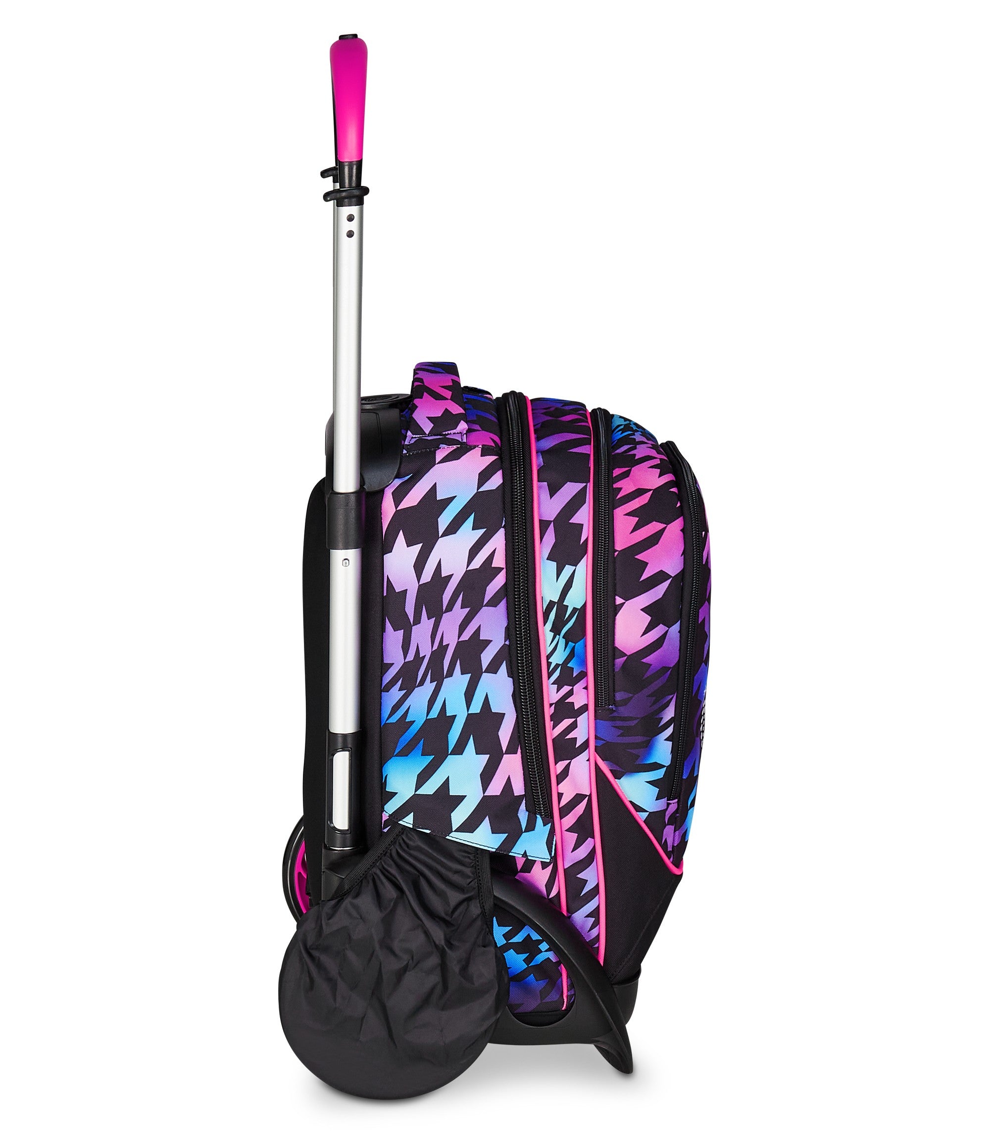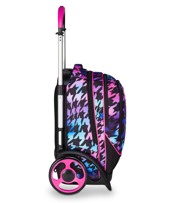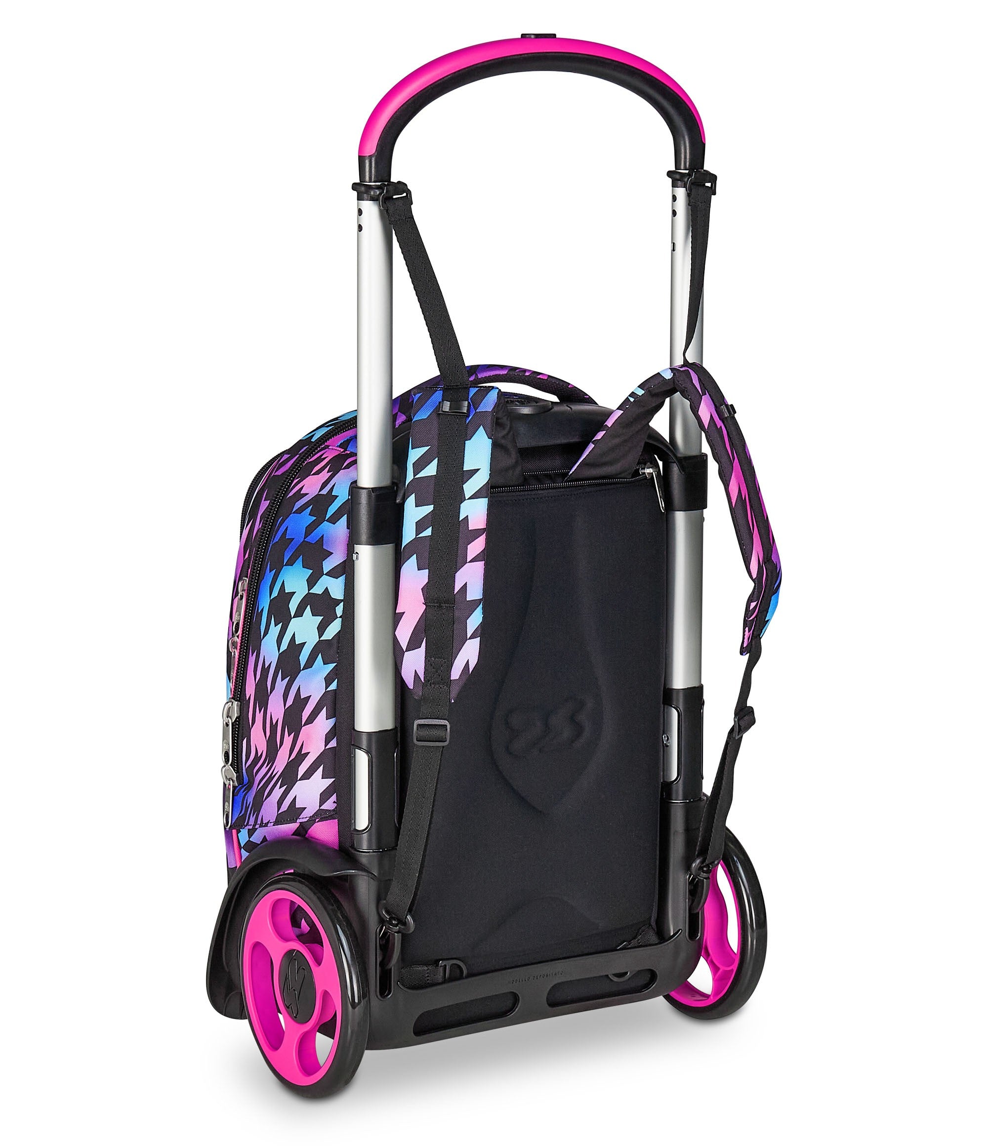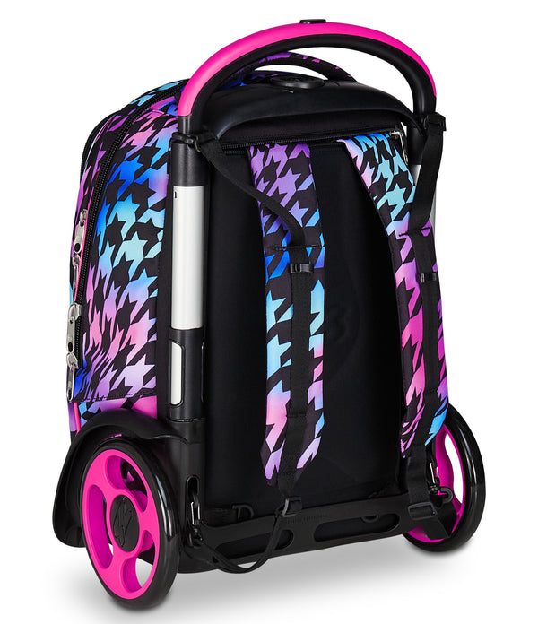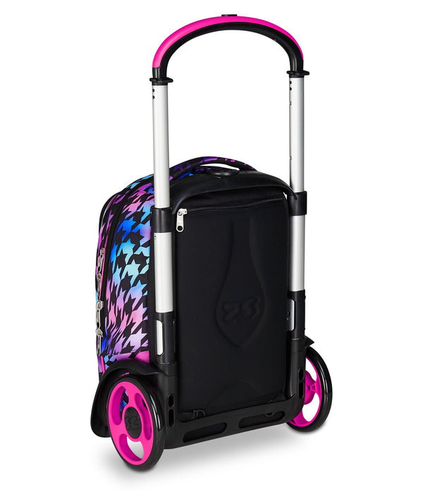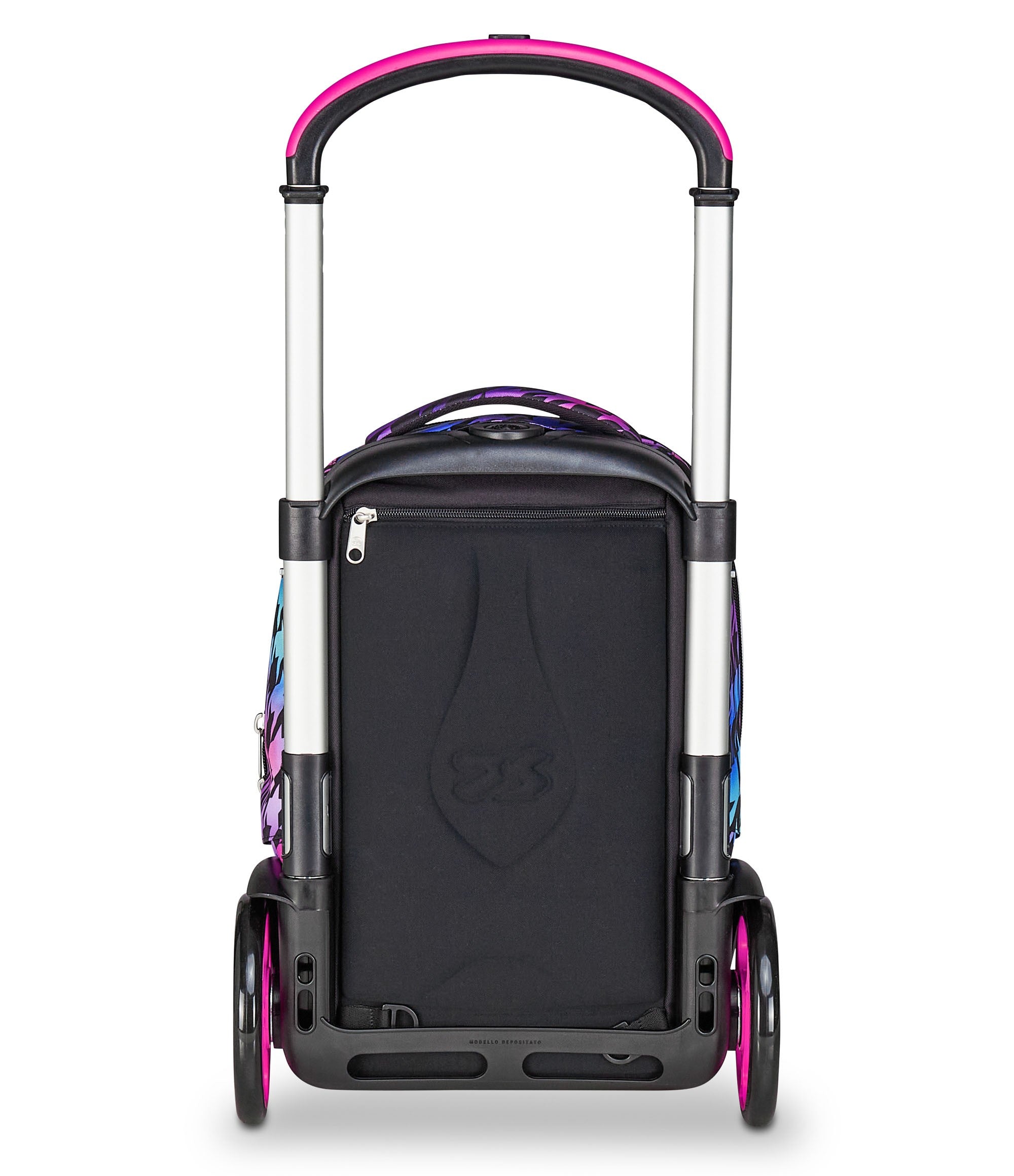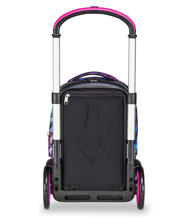 Maxi wheels 17 cm and wheel cover. Three uses: 1) Luggage 2) Backpack 3) Wheeled Backpack. Backpack both with and without removing the trolley chart.