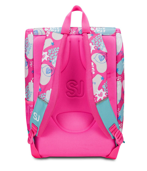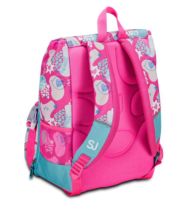 Hi! I’m PINKFUR, the SJ GANG extendable backpack you go to school with, but you can also play! On the flap I have a transparent pocket with soft plush inserts closed with zip inside which you will find a fantastic removable kitty charm. I have a double spacious compartment, of which you can easily increase the capacity through the side zippers to be able to accommodate and distribute books, notebooks and everything you need for your day, You can also use the front pocket with paws and the bottle pocket. They are also really comfortable to wear on the shoulders, thanks to the comfortable back and shoulder straps. In addition, the integrated bottom keeps my structure unchanged, ensuring the stability of the content even at full load.