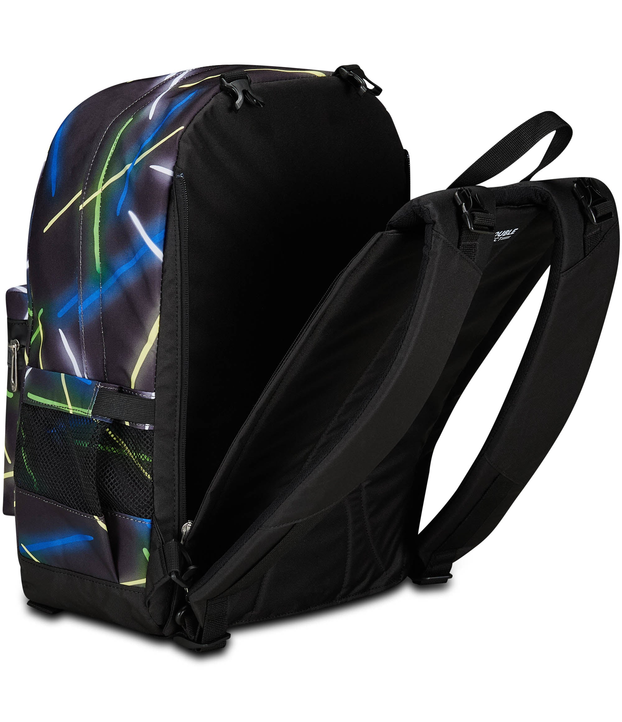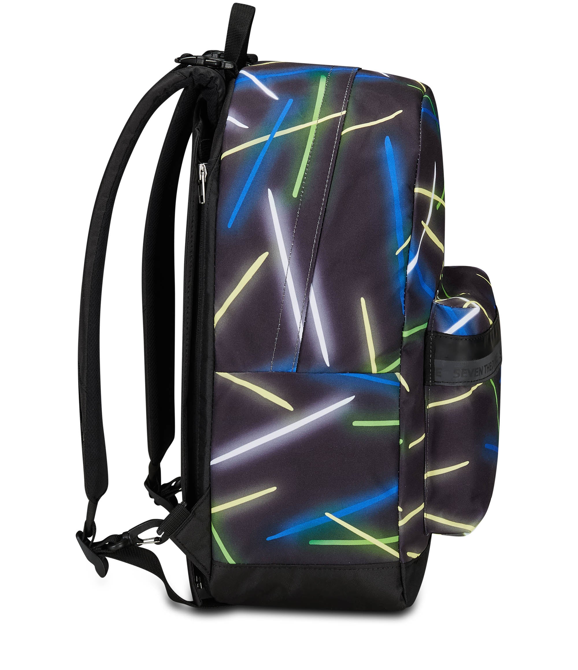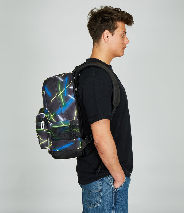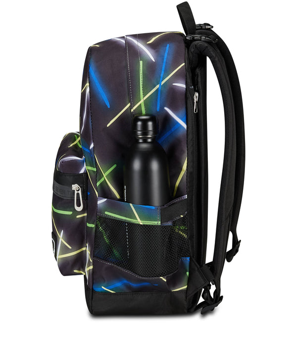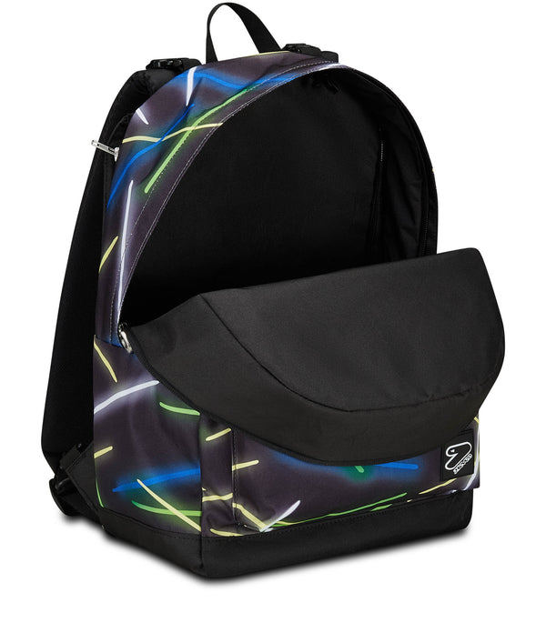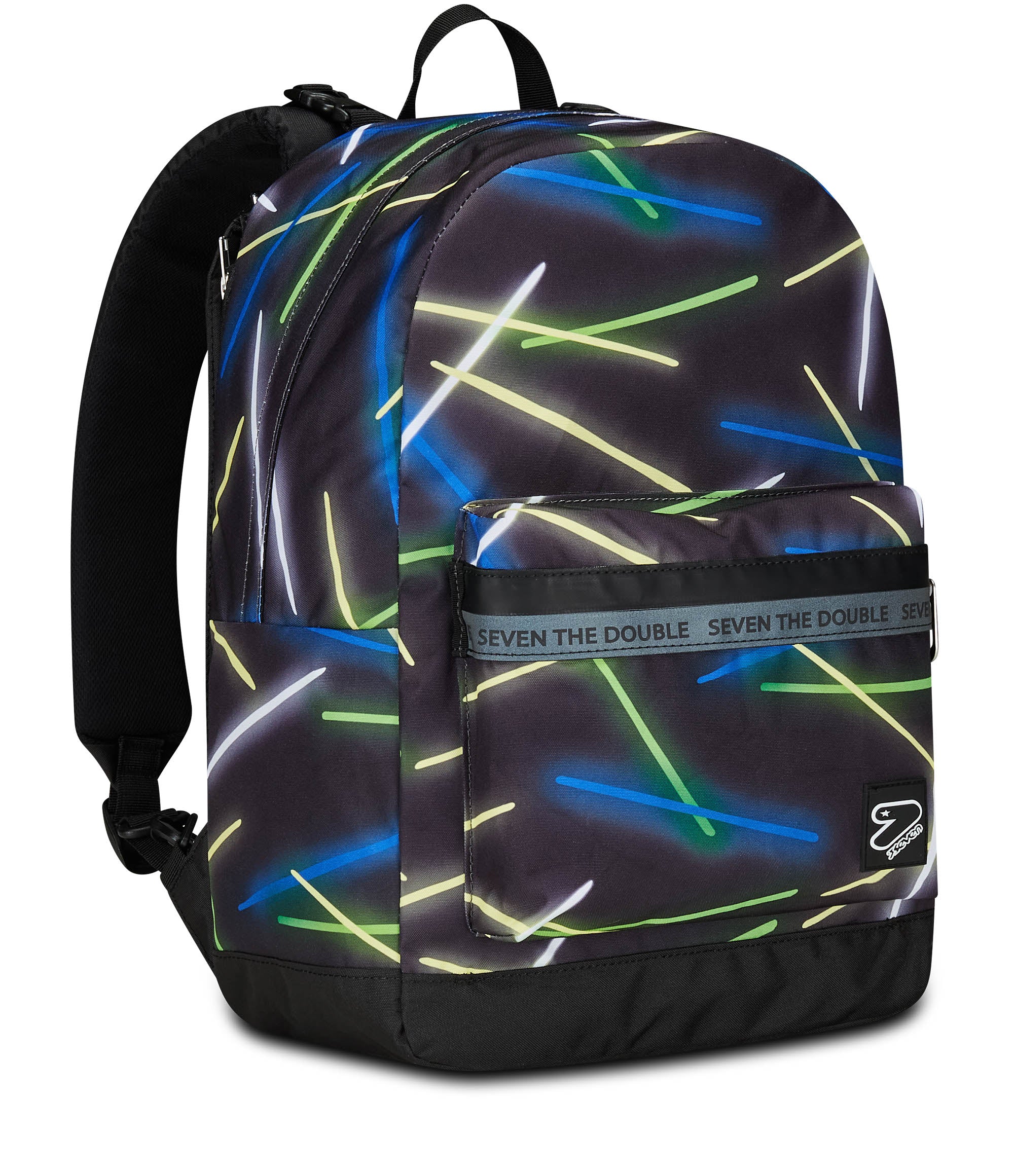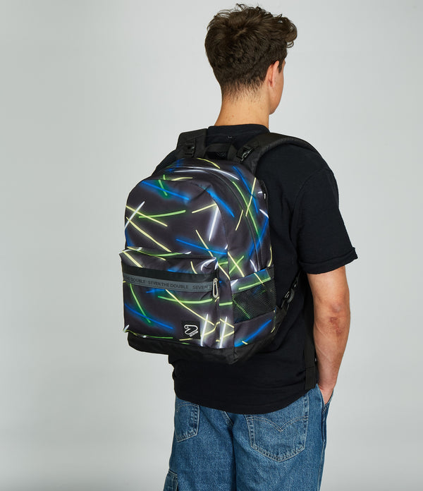 With this Seven The Double reversible backpack, which includes the EARPHONES WIRELESS LED, you have 2 backpacks in 1: the first in patterned with reflective zip, the other in solid color. To turn it over as many times as you want, detaching the back, you just need a few simple moves. It is made of 100% recycled polyester fabric, GRS certified, made from 29.5 PET bottles of 500 ml each, ensuring all the quality standards of our materials. Both sides, in pattern and solid color, have a comfortable front pocket. The patterned one also has a mesh side pocket and elastic water bottle holder, while you can enjoy customizing the one in solid color with matching markers. Finally, the back is padded and, together with the padded and breathable shoulder straps, makes the backpack comfortable to wear on the shoulders.