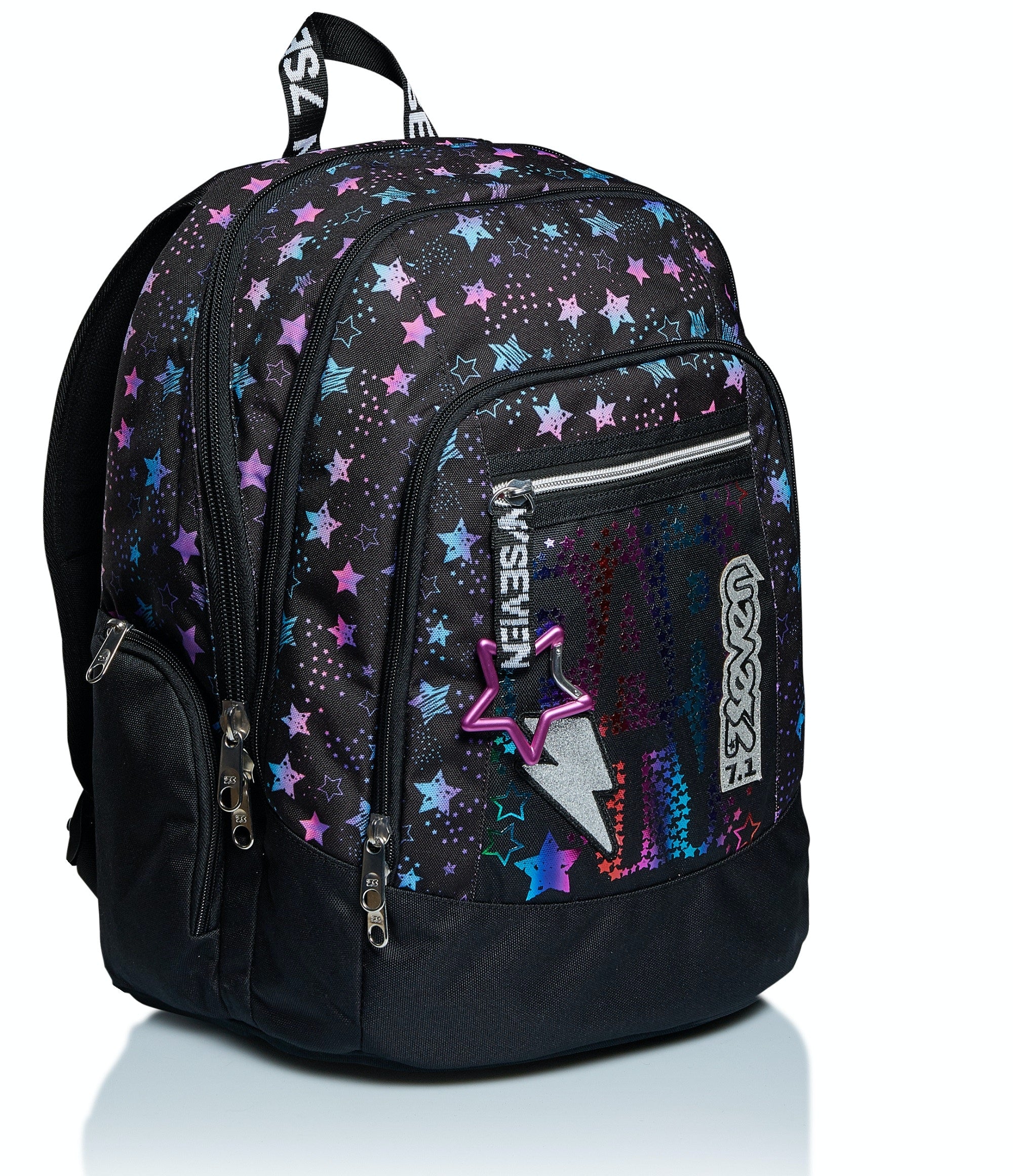 Doppio scomparto. Con SPEAKER WIRELESS amovibile sullo spallaccio e moschettone amovibile. Applicazione glitter.