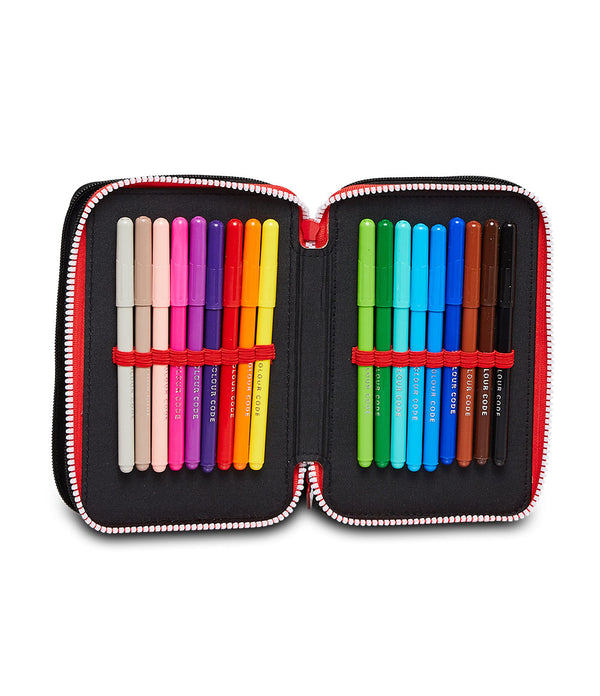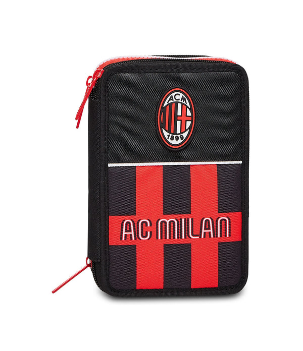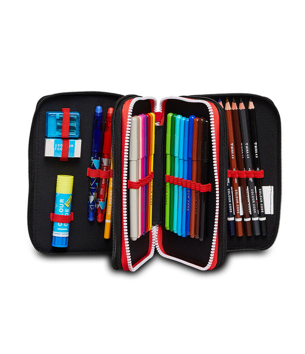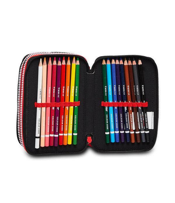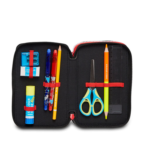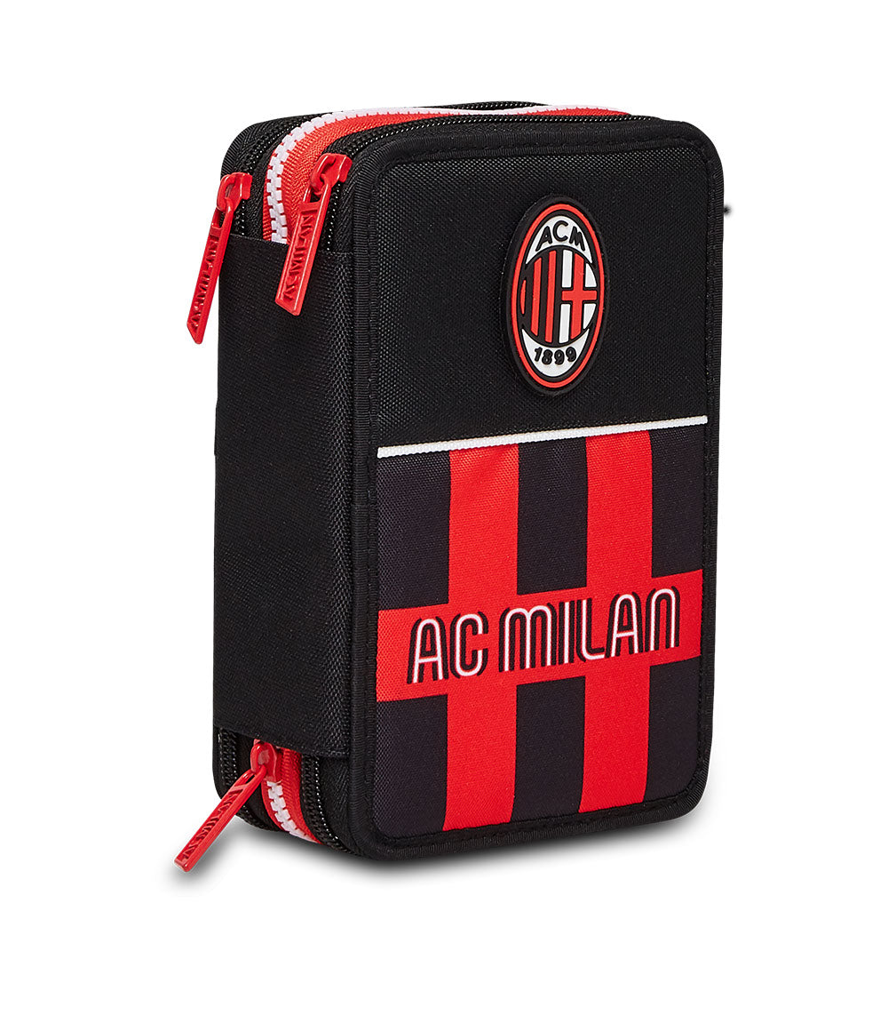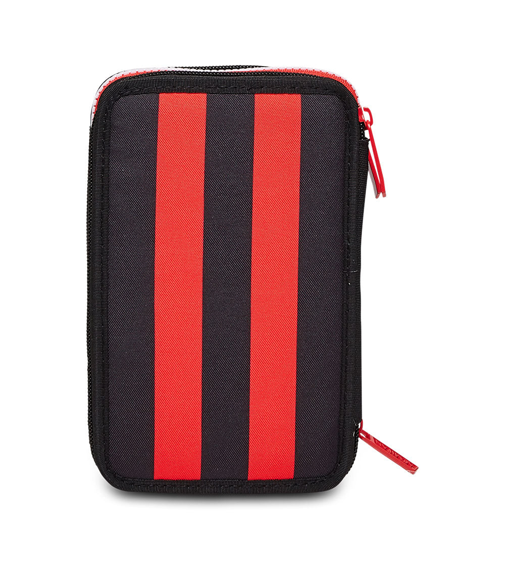 L'Astuccio 3 Zip MILAN ha un triplo scomparto accessoriato con tutto il materiale necessario per vivere al massimo la tua giornata di scuola: 1 penna cancellabile con inchiostro blu, 1 penna a sfera con inchiostro rosso, 18 pastelli, 18 pennarelli, 1 matita, 1 gomma, 1 temperino, 1 righello trasparente, 1 forbice in metallo con maniglia in plastica. Abbinalo con uno zaino o un trolley MILAN.