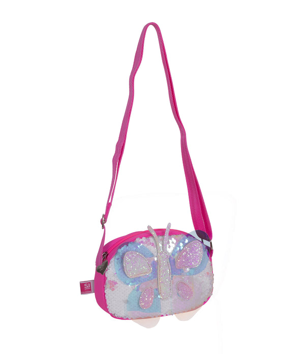 - Chiusura con zip. Cursore personalizzato. Tracolla fissa e regolabile in nastro. Farfalla applicata in crystal iridescente semitrasparente e dettagli scintillanti.