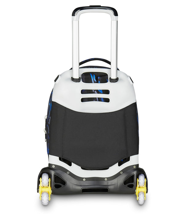 - Trolley scomponibile con sistema a tre ruote, Crossover System con clips per l’aggancio dei nastri, doppia barra telescopica con due regolazioni in altezza, fondo rinforzato e protezioni angolari. 3 possibili utilizzi: 1) uso trolley con spallacci a scomparsa totale nello schienale; 2) uso zaino senza sganciare il carrello; 3) uso zaino quando completamente sganciato dal carrello