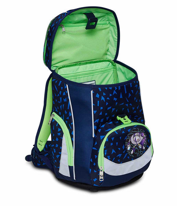 Ciao! Sono il nuovo zaino UPDOWN BOX SJ Gang! Sono pensato per accompagnarti a scuola in modo colorato e divertente! Ho ottenuto la certificazione IGR che conferma la mia ergonomia. Infatti la mia struttura favorisce grande comodità e libertà di movimento quando sono indossato, mantenendo una distribuzione del carico uniforme. Poi ho spazi dedicati, pratici e organizzati per ogni cosa di cui tu possa aver bisogno durante la giornata:  libri, quaderni, borraccia e altro ancora. Sono semplice da aprire e chiudere grazie alla fibbia magnetica. Compatto e pratico, la mia struttura rigida con schienale regolabile dà la giusta stabilità al contenuto. Infine ci tengo a precisare che sono realizzato in tessuto 100% poliestere riciclato certificato GRS, ricavato da 36,5 bottiglie in PET da 500 ml ciascuna, rispettando tutti gli standard qualitativi dei nostri materiali.