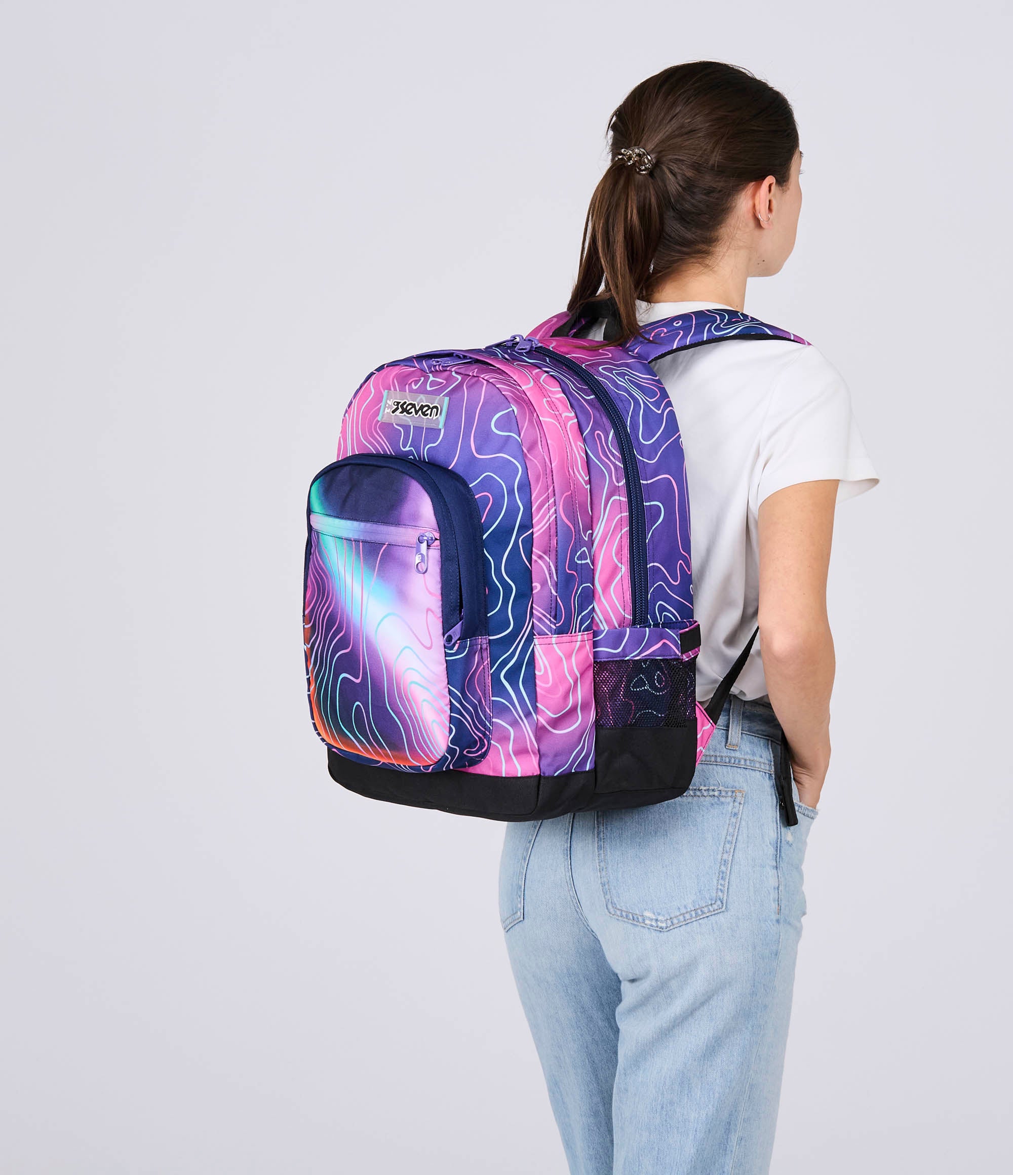 Controlla di aver messo quello che ti serve prima di uscire di casa, tanto sai che nel doppio scomparto del tuo nuovo zaino Seven Freethink c’è tutto lo spazio per mettere libri e quaderni, ma anche per un cambio da metterti per una partita al campetto nel tempo libero. Hai messo il PC o il tablet nello scomparto interno? E la borraccia nella tasca laterale? Bene! Finalmente puoi andare a prendere il bus per la scuola. C’è un bel pezzo fino alla fermata, ma grazie a schienale e spallacci confortevoli, lo zaino Freethink è molto comodo da indossare sulle spalle.